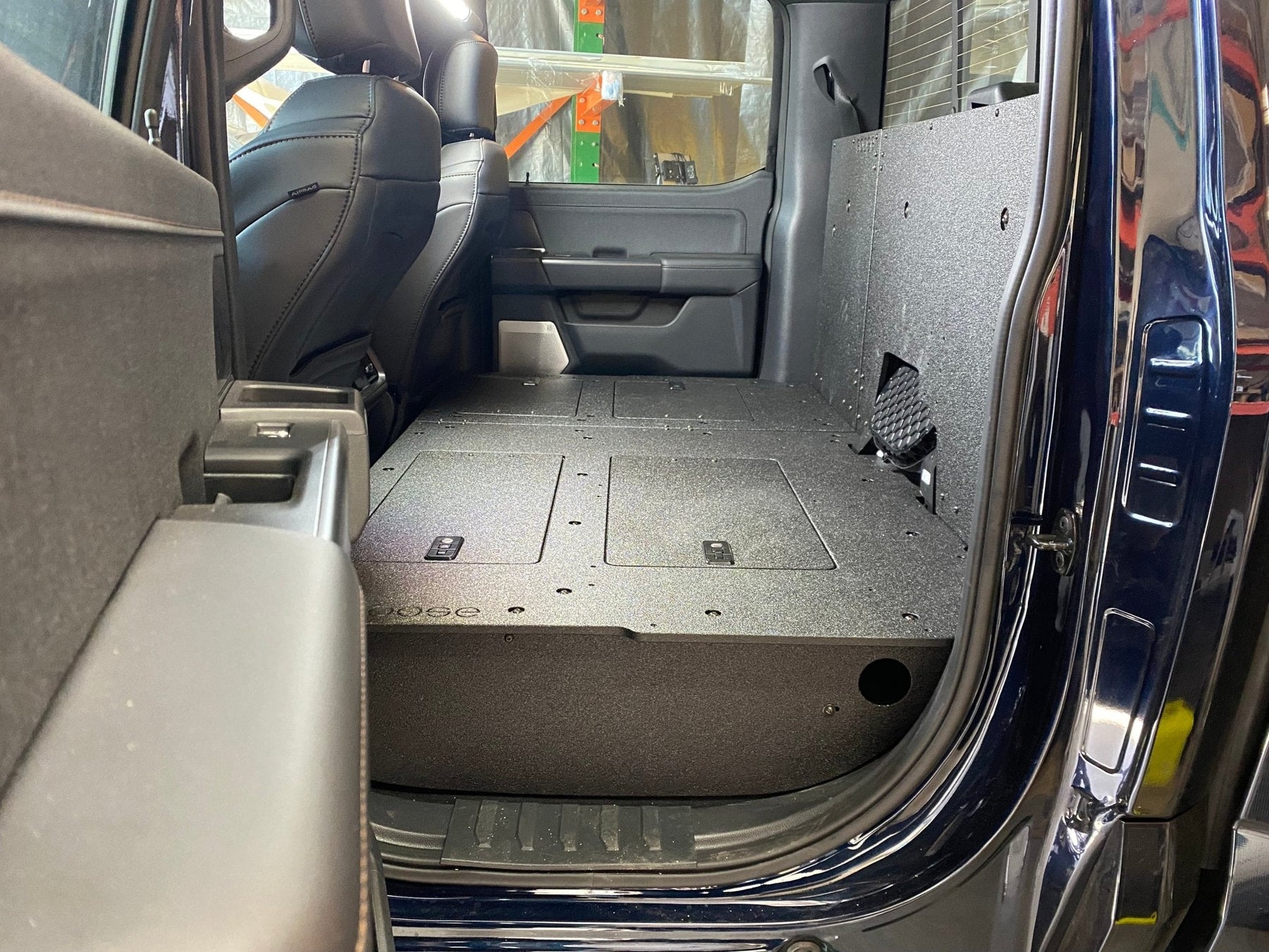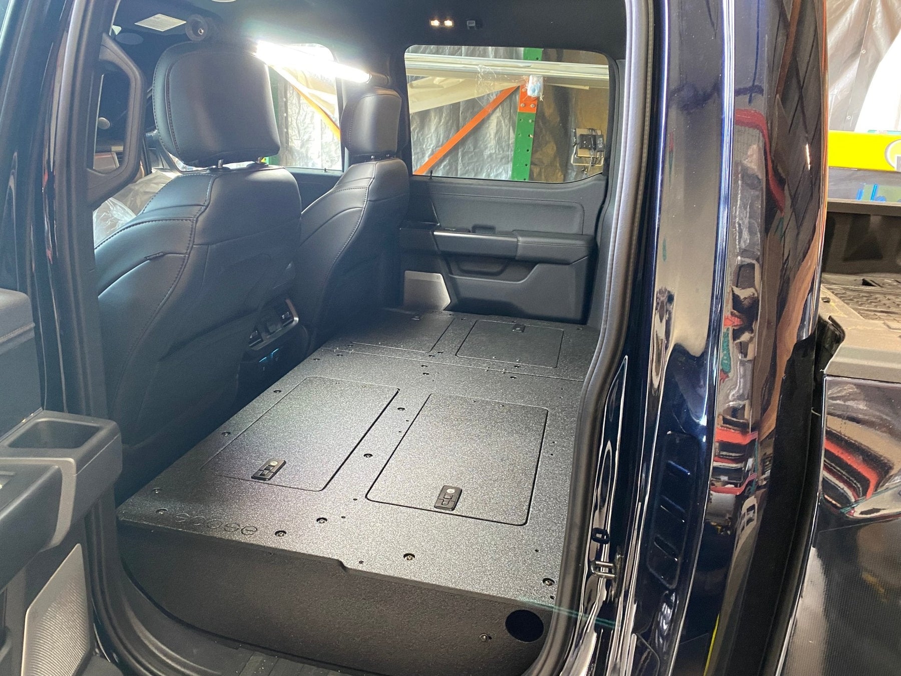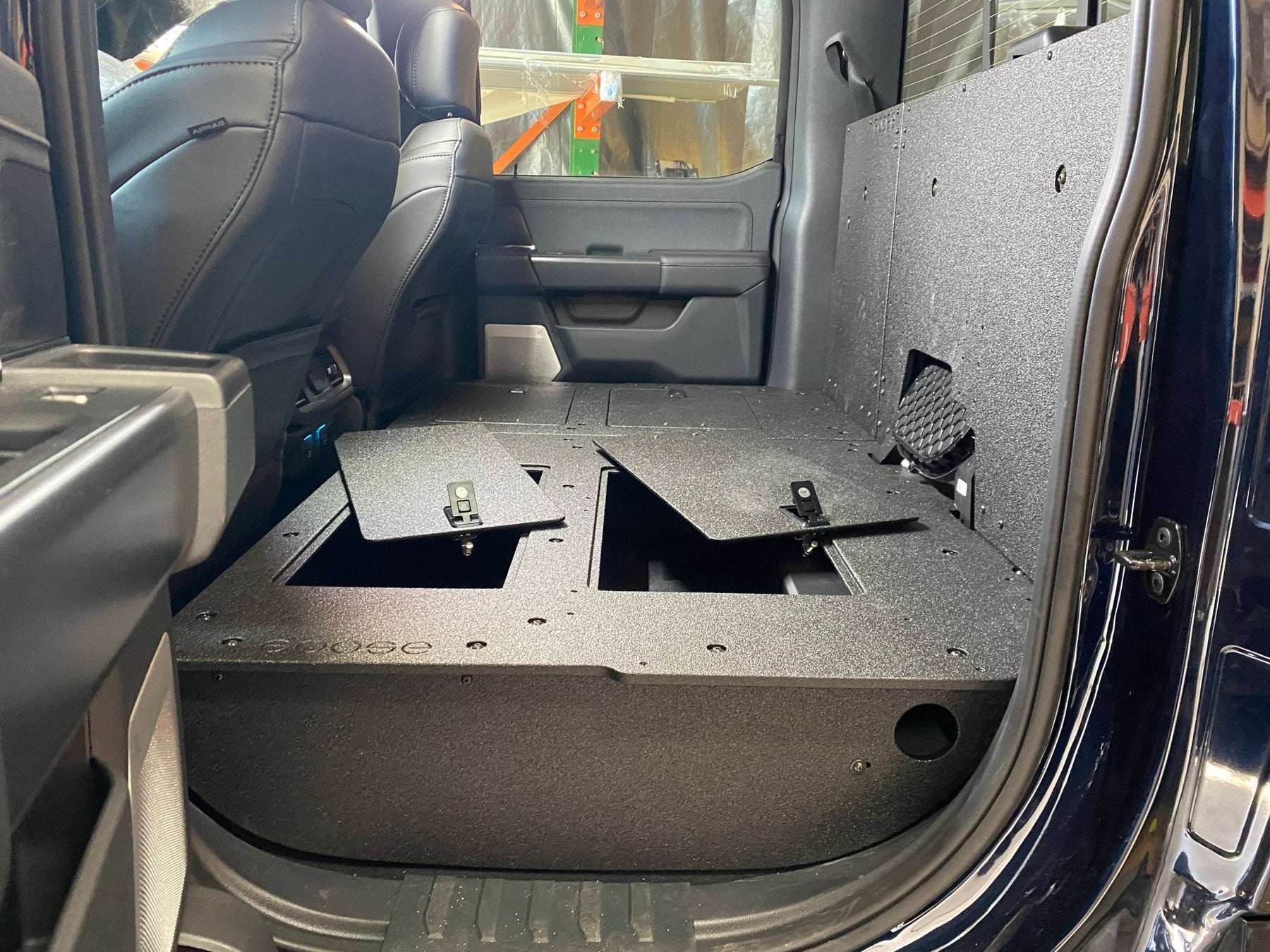 The Ford F250-F350 second row seat deletes for the Crew Cab 4 door are designed for you to easily remove your rear seats and create a flat and secure platform to secure your gear to. The platform includes hatches that allow access to the factory storage space below the rear seats. In addition to the base plate, you also get a back wall replacement that is secured to the base plate and the factory anchors points in the back wall.