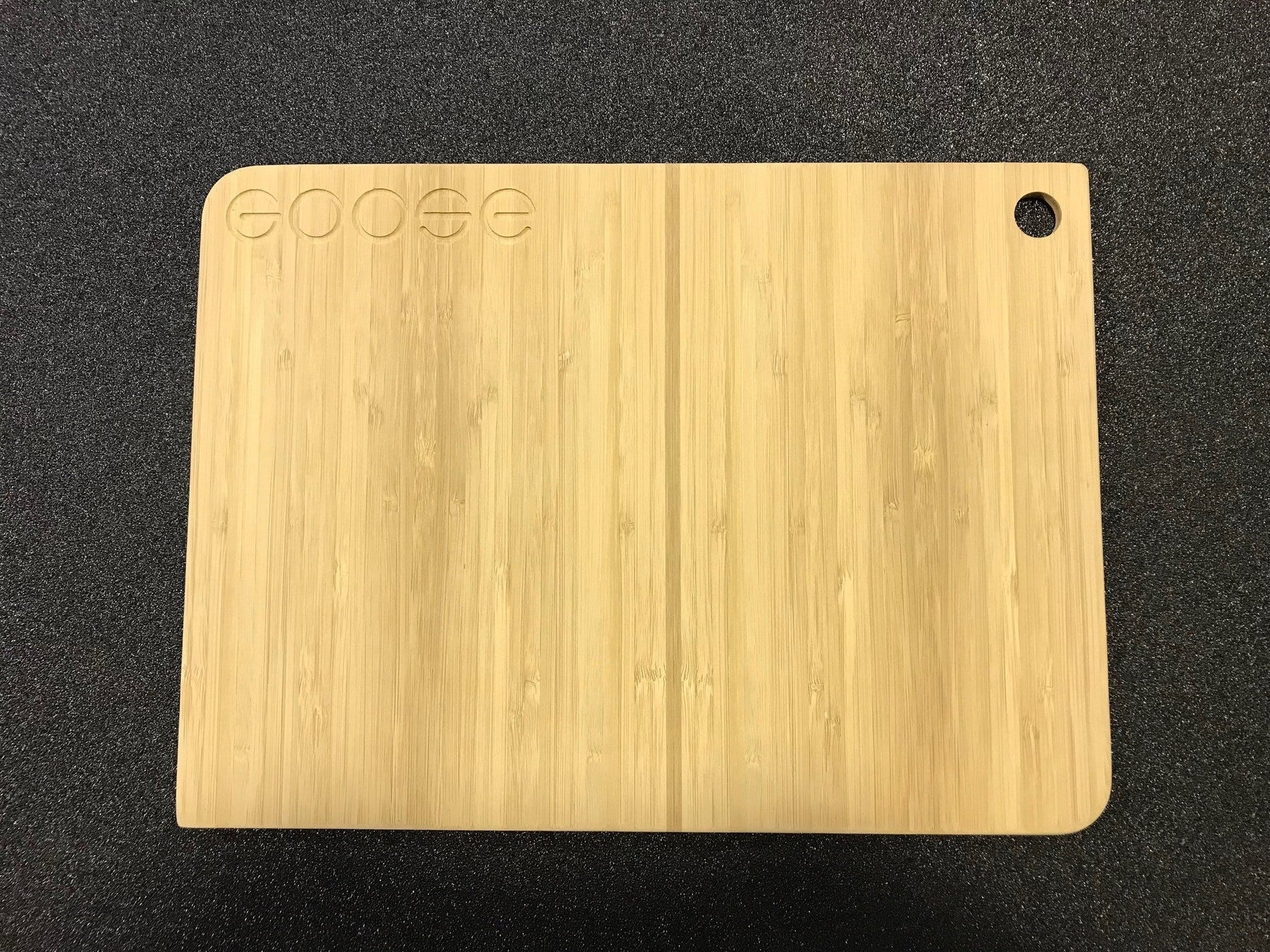 The Goose Gear cutting board is made from 1/2" thick multi ply Bamboo. It measures 15" wide x 11" long and has a hole cut into it for hanging it out dry while out on the trail.