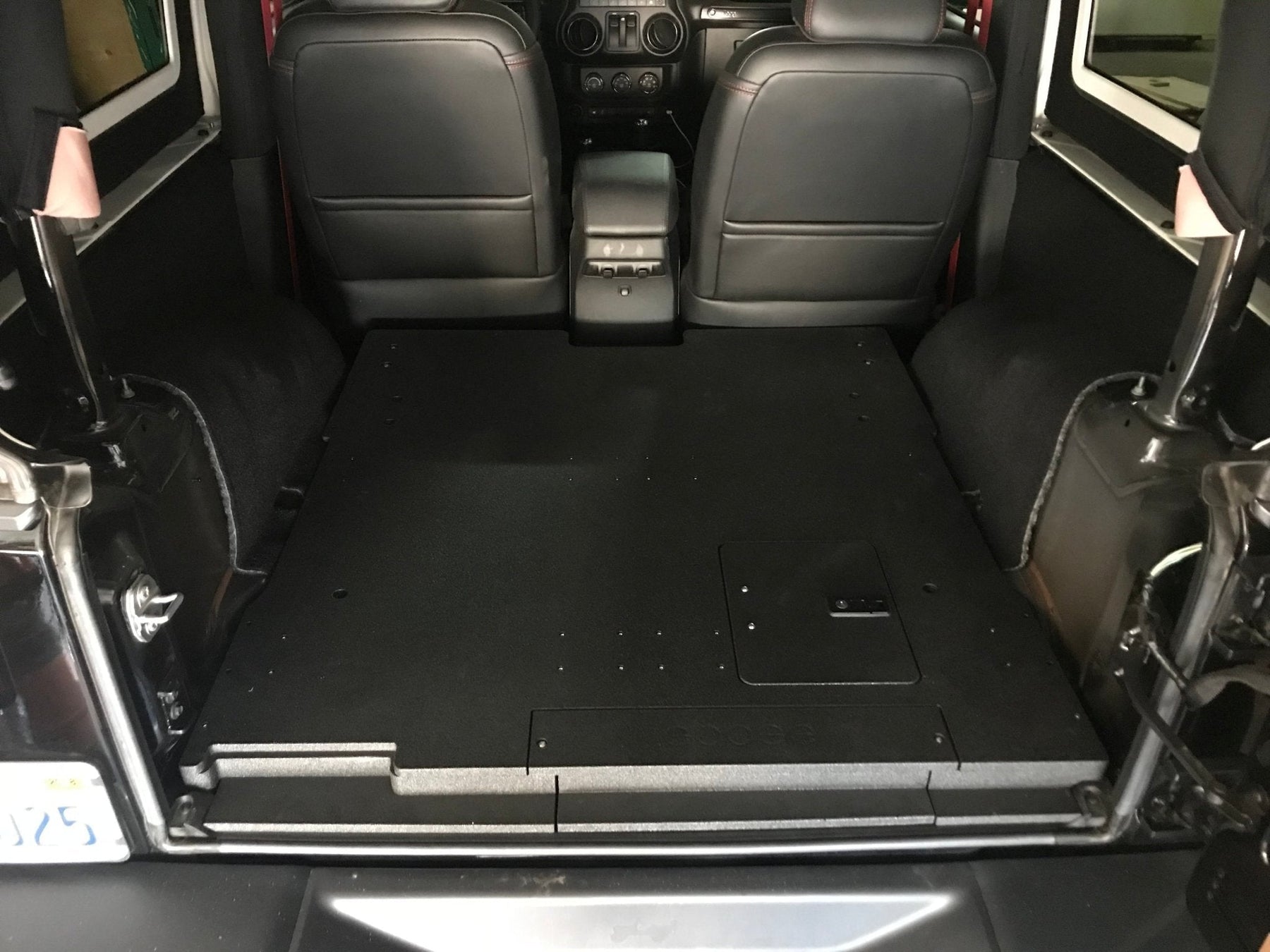 The Jeep Wrangler JK 2 Door Rear Plate System requires removal of the second row seats and plastic trim in the rear cargo area for installation. The extra depth of the 2 door plate you can use the deeper modules such as the 36" deep Single Drawer Modules and the 28" deep Double Drawer Modules. You can also use the standard IceBox and CampKitchen units including the CampKitchen 2.2.