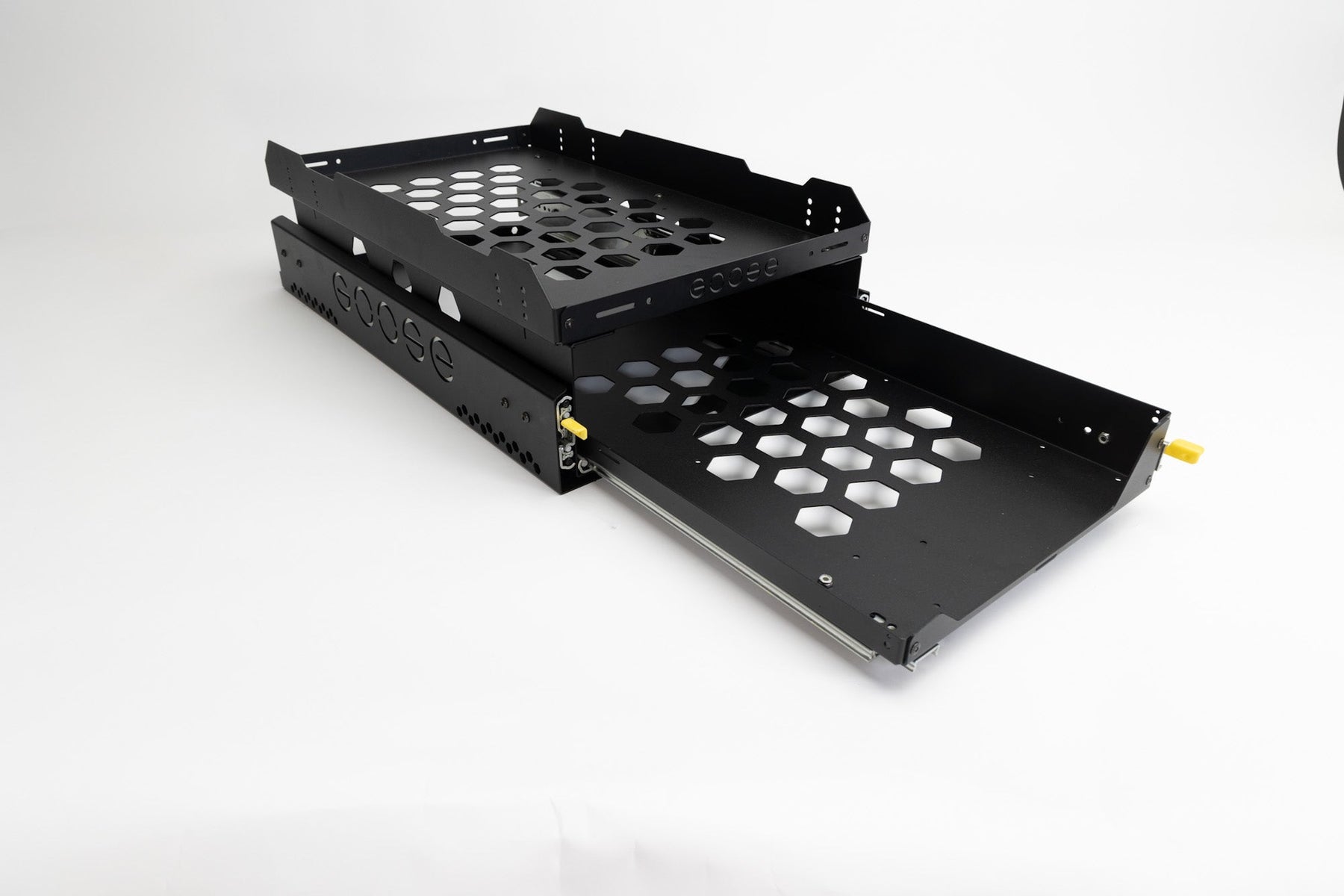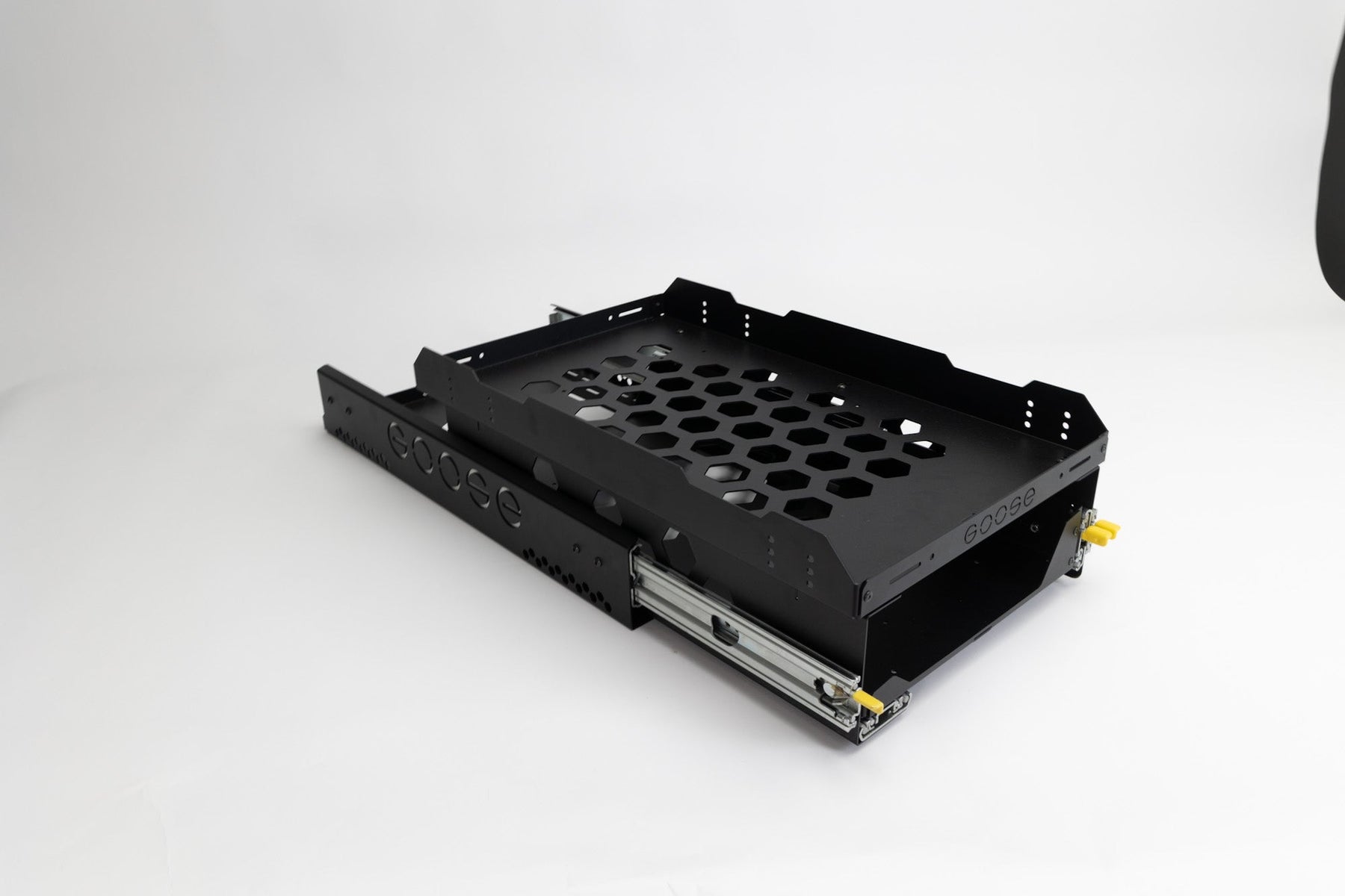 The Solo CampKitchen low profile refrigerator and stove slides that is designed to mount to the Goose Gear Plate System. It features a full extension tray with Lock-In/Lock-Out capability.